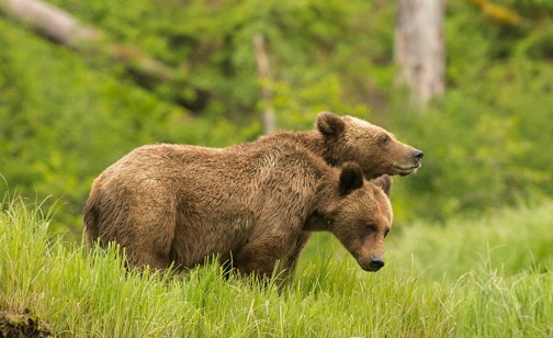 How can anyone ever completely explain what we feel when a mother Grizzly sits on the grass in front of us, just feet away, closes her eyes and hums, while her cub noisily nurses? Or how it makes you laugh out loud when the cub sits like a human being in the grass, paws folded neatly on his tummy and stares intently at us?