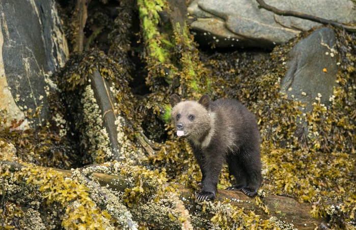 Back in Mama Bear's home territory, she had mated again after Fuzzy was weaned and the following spring, she came out of hibernation with 3 beautiful new cubs. Sadly, she lost 1 of the 3 cubs in their first year. The following series of photos are of Mama and these cubs, including the 2 that survived (that we call Girl Bear and Boy Bear. (Not very imaginative names, right?) When Mama's Girl Bear and Boy Bear were weaned, they spent at least the first year together and we've seen them together, on and off over the years since.. It is possible that Girl Bear mated in the spring of 2019, so stay tuned for updates. Could be a sad time for Boy Bear as it's unlikely that she would allow him near her cubs. Meanwhile, in 2018, Mama Bear had another set of 3 cubs. In true Mama Bear fashion, she presented her cubs to us one morning, the memory of which, still brings tears of gratitude to my eyes. Mama had literally been chased (by people from a anchored yacht), out of a safe haven that she likes to use for her new cubs, over a rock bluff, to a nearby tiny bay, where we found them feasting on berries in a bush at the edge of the rainforest. The cubs were climbing through the bush while Mama sat, human like, on a huge rock, very gently picking berries and eating them. (Her cubs still had a lot to learn in that respect.) As we slowly motored by, not wanting to disturb her and the cubs, she turned to look at us and then immediately got down off the rock, said something in mother bear language to the cubs.. before walking straight to the beach, closest to us. We do not take this kind of trust lightly, so we kept a close eye on Mama and the cubs for any sign of stress, which I'm happy to report, we never saw. The following are a series of photos from that morning as Mama taught her tiny cubs to forage for and eat barnacles.. After they'd learned from Mama how to eat barnacles, two of them began playing and fighting over a stick.. not unlike two human children fighting over a toy. Make sure you check out the facial expressions! While Mama Bear... and all of her cubs.. have had infinite patience with humans that behave respectfully, she was tested that spring, by people on private yachts, trying to get too close to her and the cubs and by people who were allowing their dogs to run wild in areas of her territory where she typically likes to reside when she's had new cubs. Fortunately, she shares her territory with the Kitasoo Xai'xais People of Klemtu who in partnership with BC Parks, are developing a new management plan for this area. And the news gets even better... In this very remote inlet where Mama Bear lives and has raised all of her cubs, there will be an outpost cabin built for the Kitasoo Xai'xais Coastal Guardian Watchmen to stay at and watch over bears like Mama Bear, Girl Bear, Boy Bear, and her latest 3 cubs and this spectacular, biodiverse inlet with its critical habitat for Grizzly Bears, spawning salmon, the red listed Marbled Murrelet and a host of other terrestrial and marine plants and animals. We are inviting all of you who have traveled here with us, who have spent time with Mama Bear and her cubs, to help the Kitasoo Xai'xais People build this cabin to ensure the future of these bears and their critical habitat.