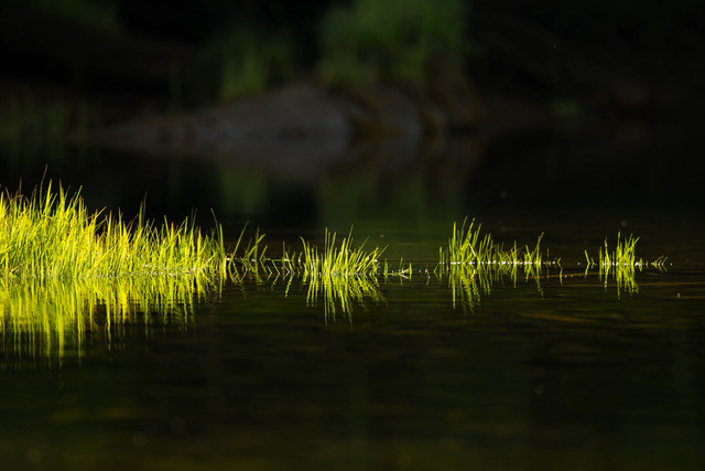 Floating in our 18 ft zodiac we are all mesmerized by the reflections in the perfect calm of the tidal channel... beauty found in such simplicity... patterns where the forest meets the water... a mother merganser and babies dwarfed by sedge grass.. and the thunder of a nearby waterfall as it tumbles out of the rainforest.